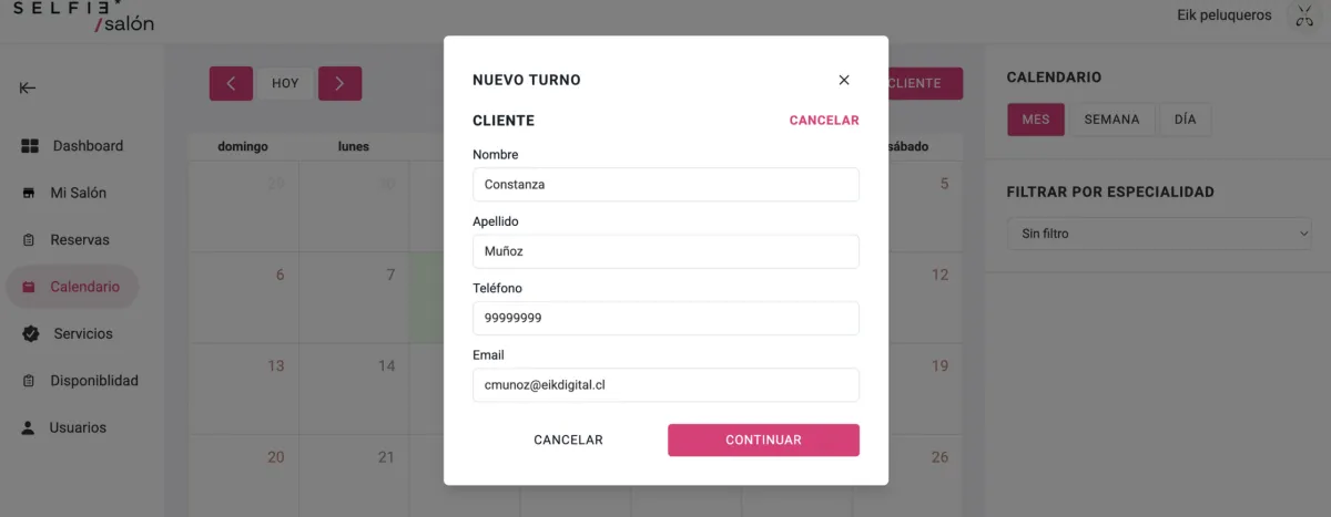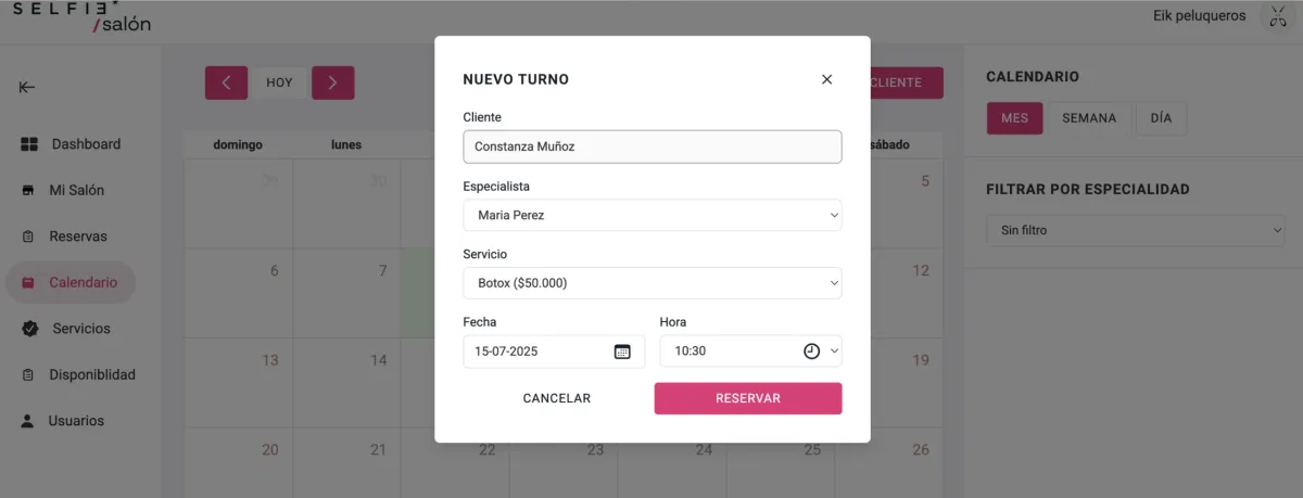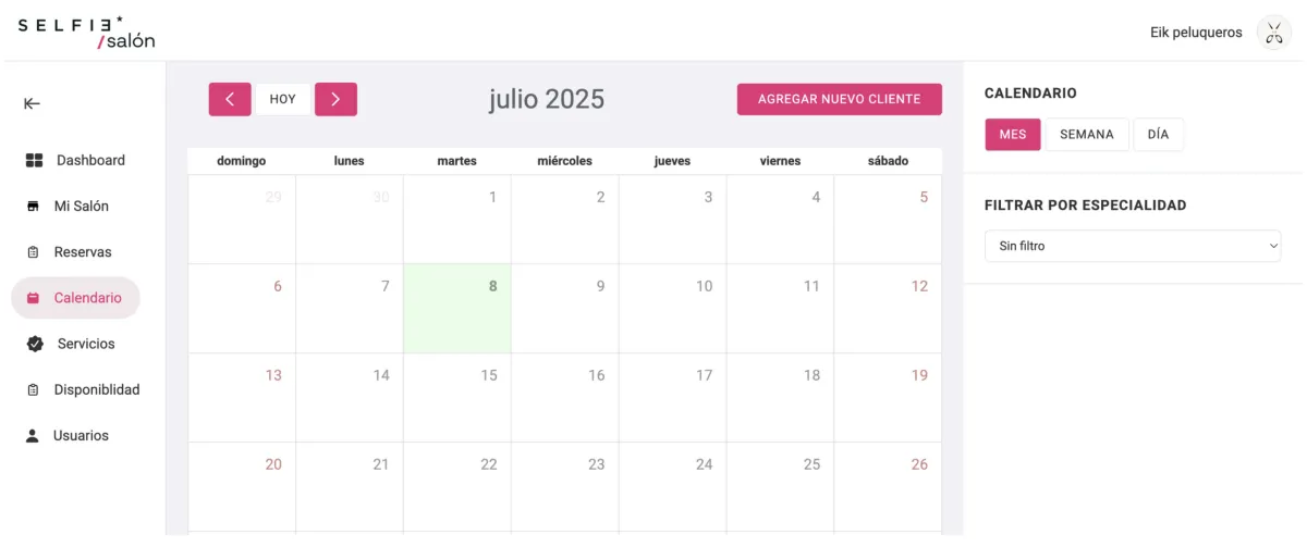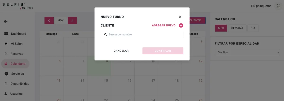 Por un lado, un cliente puede reservar directamente en el perfil de tu Salón, pero si deseas generar una Reserva por el cliente o en los casos en que el Recepcionista (por ejemplo) esté agendado la próxima visita del cliente para el mes siguiente, podrás hacerlo directamente en el Calendario.